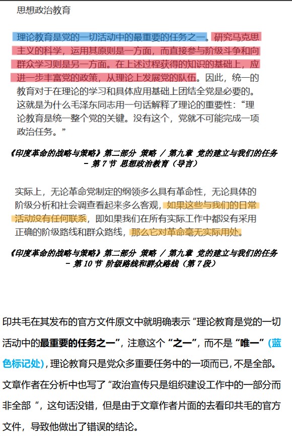 我们很明显能看到,笔者引用的段落与“人民战争”频道所引用的段落,其指向的原则是不一致的,是互相打架的,笔者所引用的段落把解决革命干部的政治水平低的问题的方法,总结为培养革命干部成为作家等等;然而,革命者的政治水平,主要是路线斗争培养的,其人的文化水平与写作文风只是次要的,而印共毛在这个策略上提了次要的东西,没有强调主要的。那么,这种策略反映的原则是“把理论教育拔高到了超过路线斗争的程度”,是违反“理论教育要为革命实践服务”的,这种策略违反了革命的原则。
