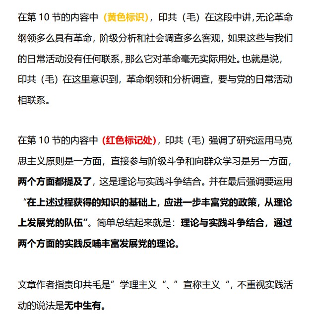 印共(毛)自己就在官方文件里承认,革命纲领要是没能在实际工作中发挥作用,那将对革命无用。本频道赞同这段话,并且还列举了出来,何来“宣称印共毛永远正确“一说?不是不让你批评印共(毛),而是要批的有理有据。——《二评【马列毛主义与革命左翼时事评论频道】对印共毛所谓“错误路线”的批判》