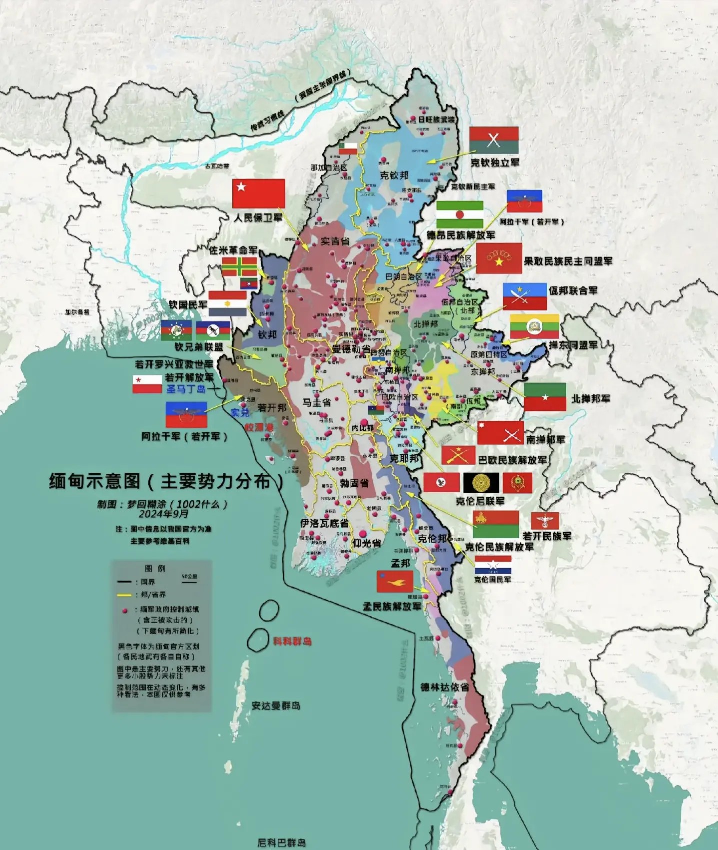 说到这,就不得不先介绍一下缅甸的局势。缅甸的现在的局势类似于大革命前的民国,中央政府羸弱,各地军阀武装割据。虽然有名义上的中央政府,但是各路军阀都不承认,都想要割据或者推翻中央政府自己当皇帝,因此各路军阀时常联合对中央政府掌控的地区进攻。更常见的是各地军阀因为利益冲突而互相征战。就比如本月初,德昂民族解放军 (TNLA) 和缅甸民族民主同盟军 (MNDAA)之间存在重大的领土争端,以及克钦独立军 (KIA) 和德昂民族解放军 (TNLA) 在重叠地区因税收和招募问题而持续摩擦。