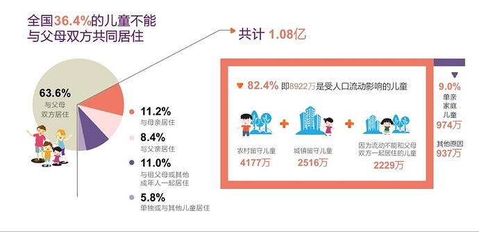 我们从《2020年第七次全国人口普查》数据,中国有6693万名0-17岁留守儿童,其中农村留守儿童4177万人,城镇留守儿童2516万人。受人口流动影响的留守及流动儿童合计达1.38亿人,近七成(9409万人)无法与父母双方共同居住,就可以直白的看到2020年的具体情况